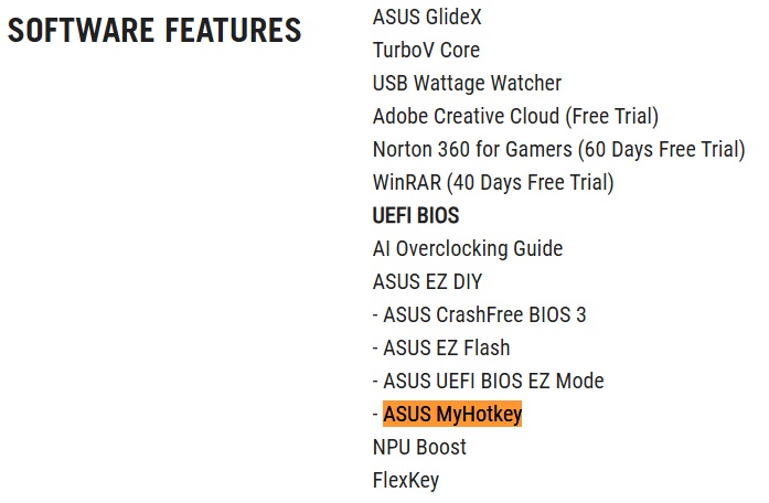 2. 製品ページの「スペック(Tech Specs)」をクリックし、ソフトウェア機能(SOFTWARE FEATURES)欄に[ASUS MyHotkey]と記載されていれば、そのマザーボードは ASUS MyHotkey 機能に対応しています。