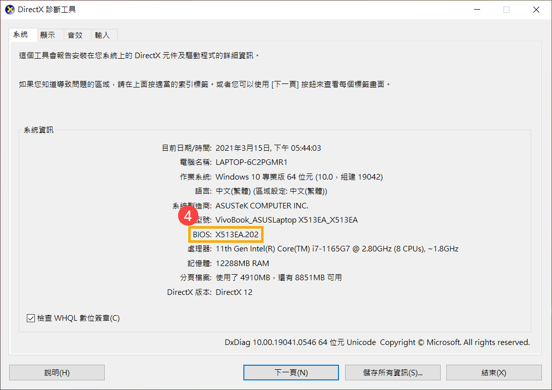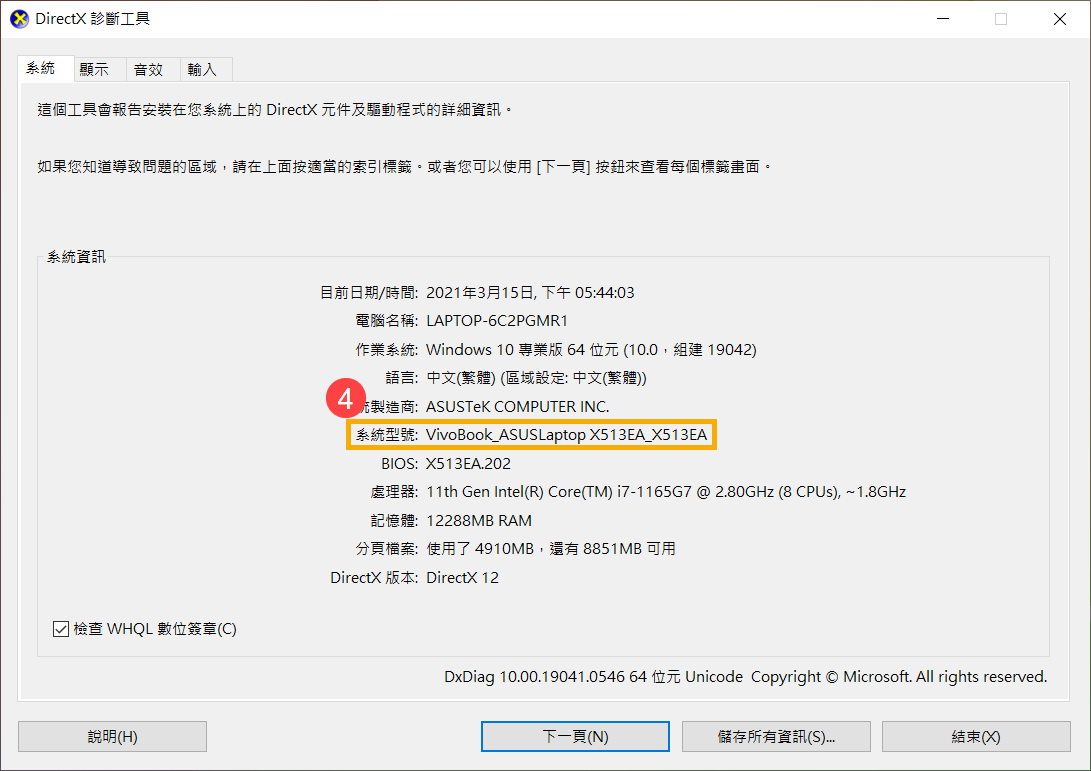 - 在系統型號欄位,即可找到您裝置的型號④。(如下圖範例中,型號為X513EA。)