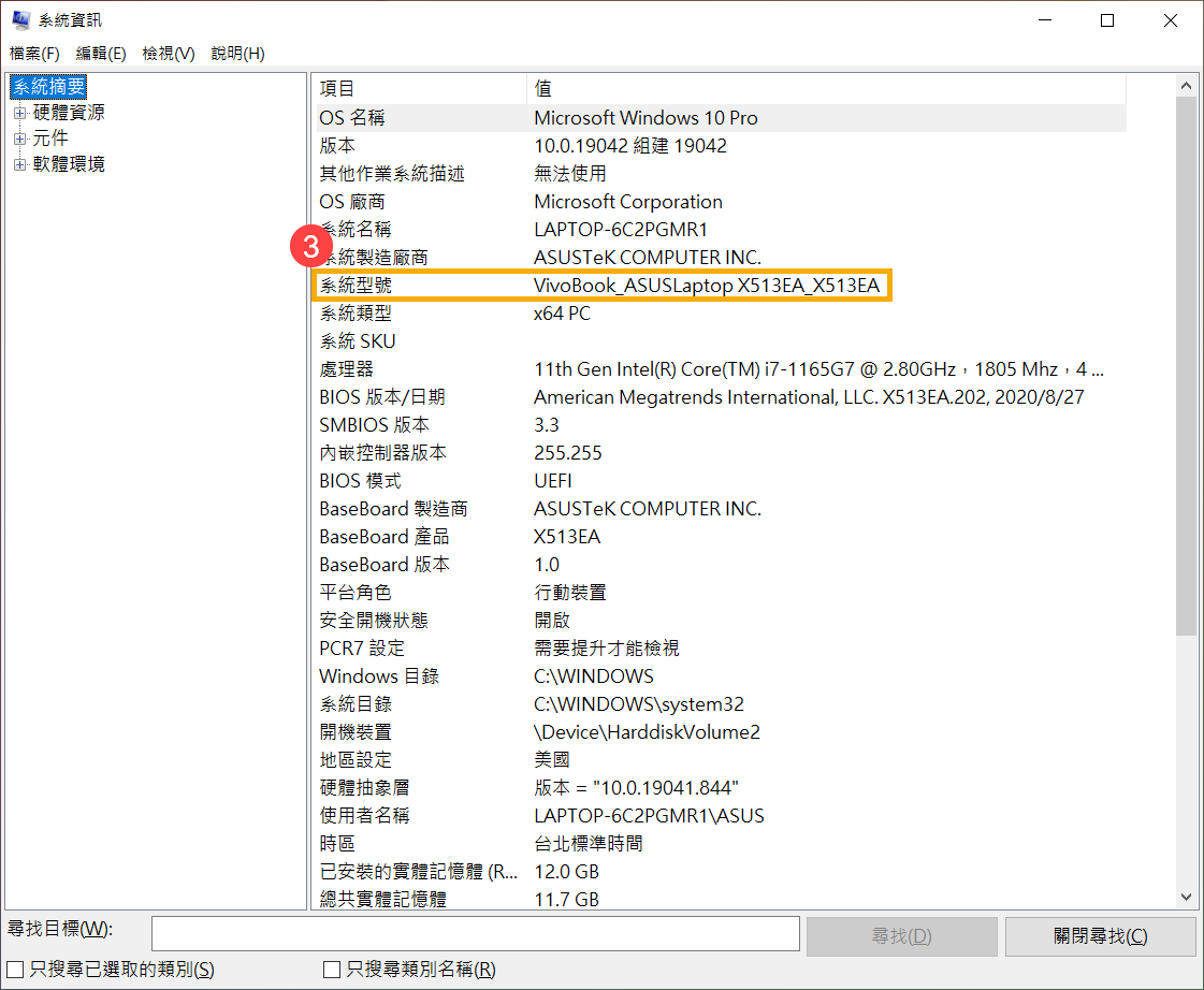 - 在系統型號欄位,即可找到您的裝置型號③。(如下圖範例中,型號為X513EA。)