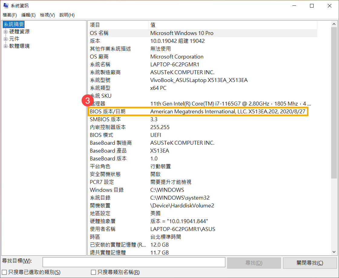 - 在BIOS版本/日期欄位,即可找到您裝置的BIOS版本③。(如下圖範例中,BIOS版本為202。)