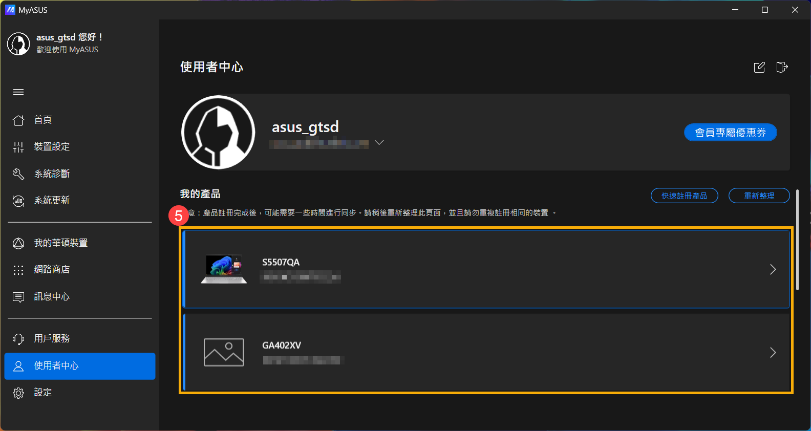 - 登入後,選擇您要查詢保固狀態的產品⑤。