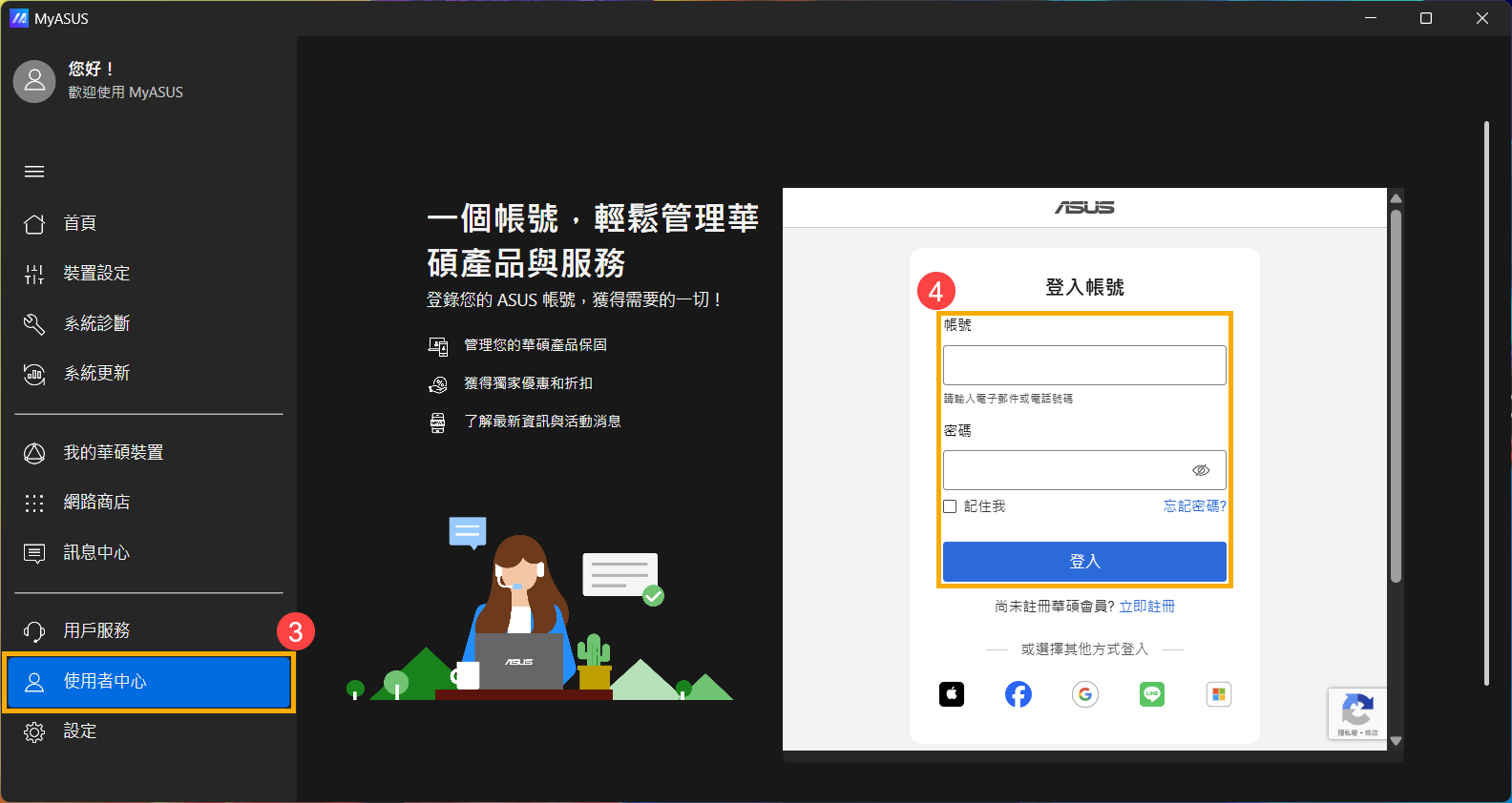 - 在MyASUS應用程式中,點選[使用者中心]③,然後登入您已註冊產品的華碩帳號④。