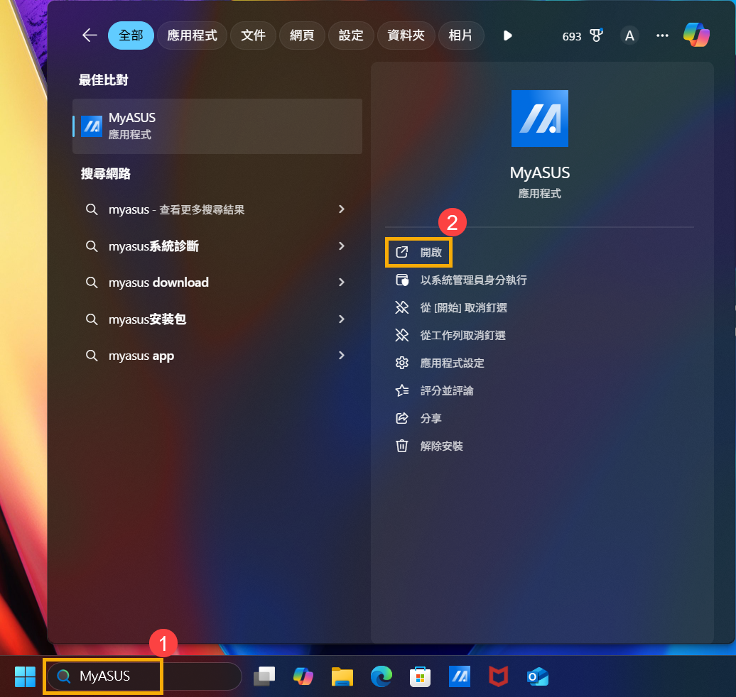 - 在Windows搜尋欄輸入[MyASUS]①,然後點選[開啟]②。