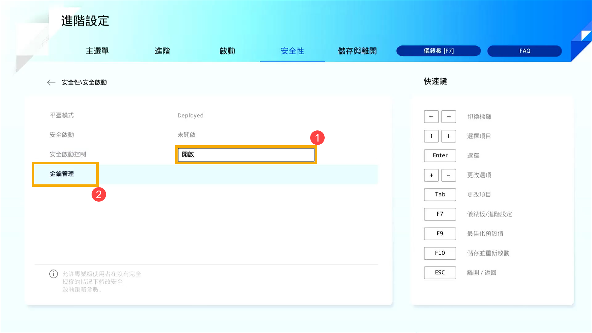 - 在安全啟動頁面中,將安全啟動控制設定為[開啟]①,然後選擇[金鑰管理]②。