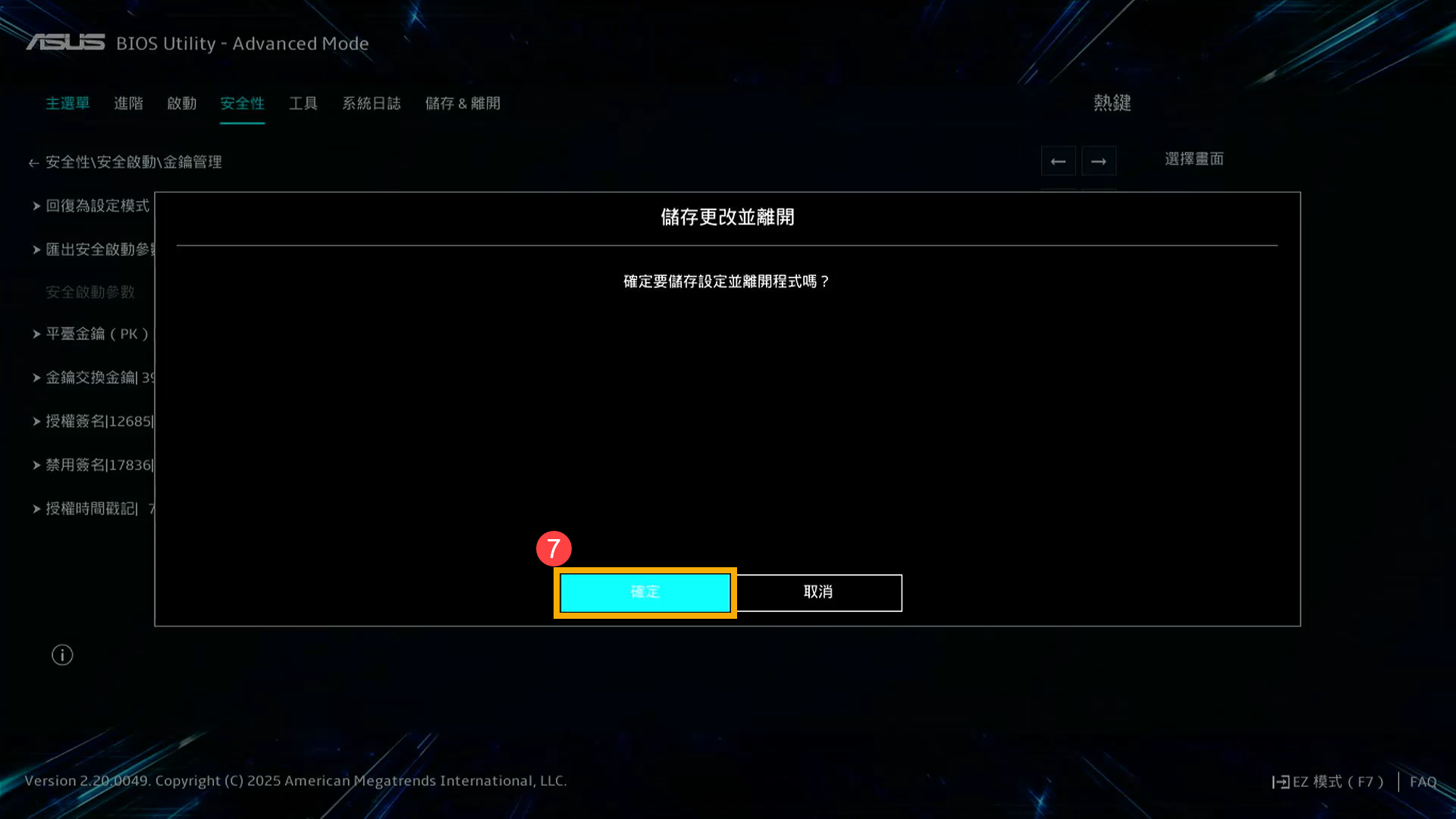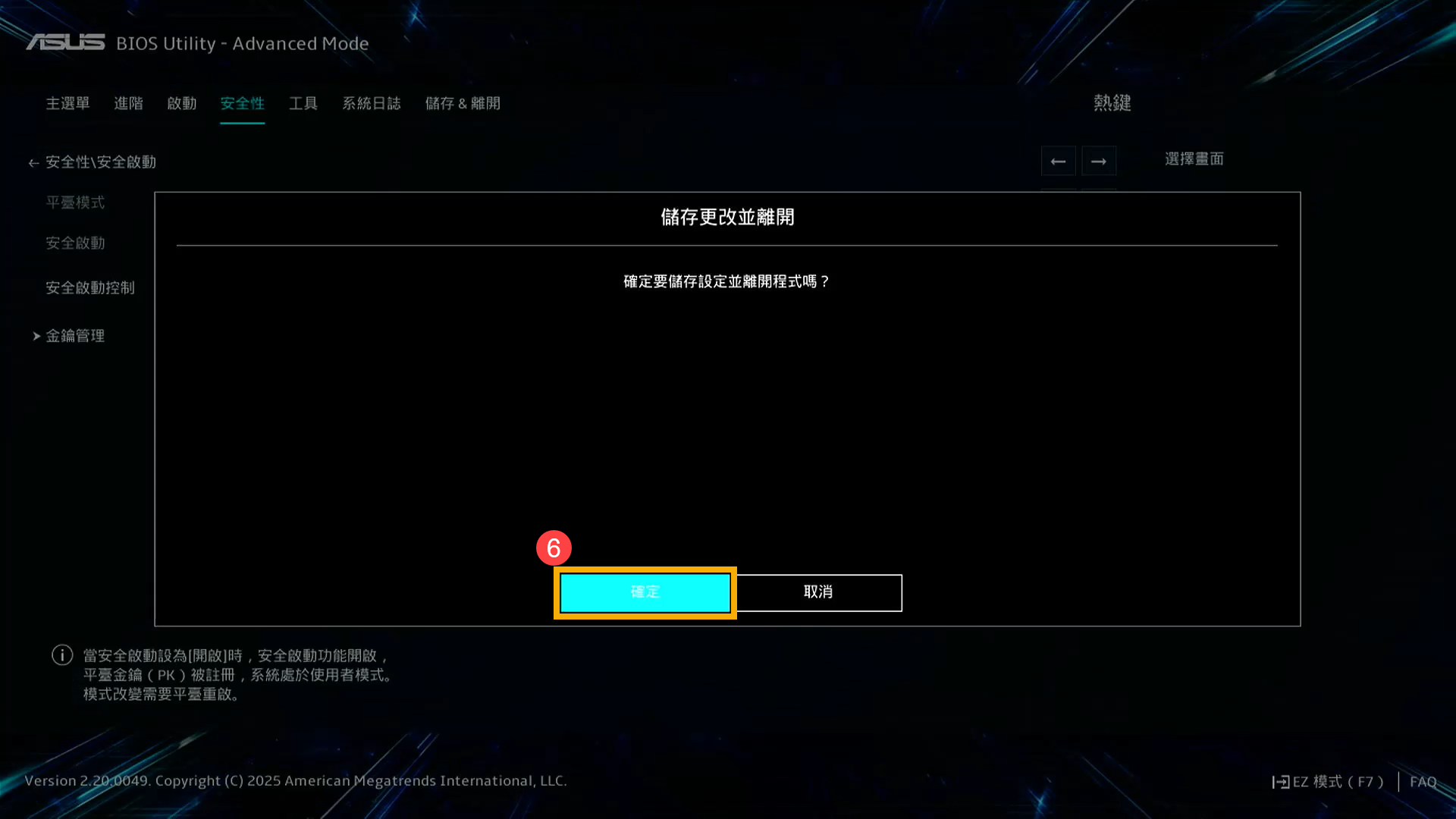 - 儲存設定並離開。按一下鍵盤上的[F10]鍵,然後點選[確認]⑥,裝置會重新開機且設定將會生效。