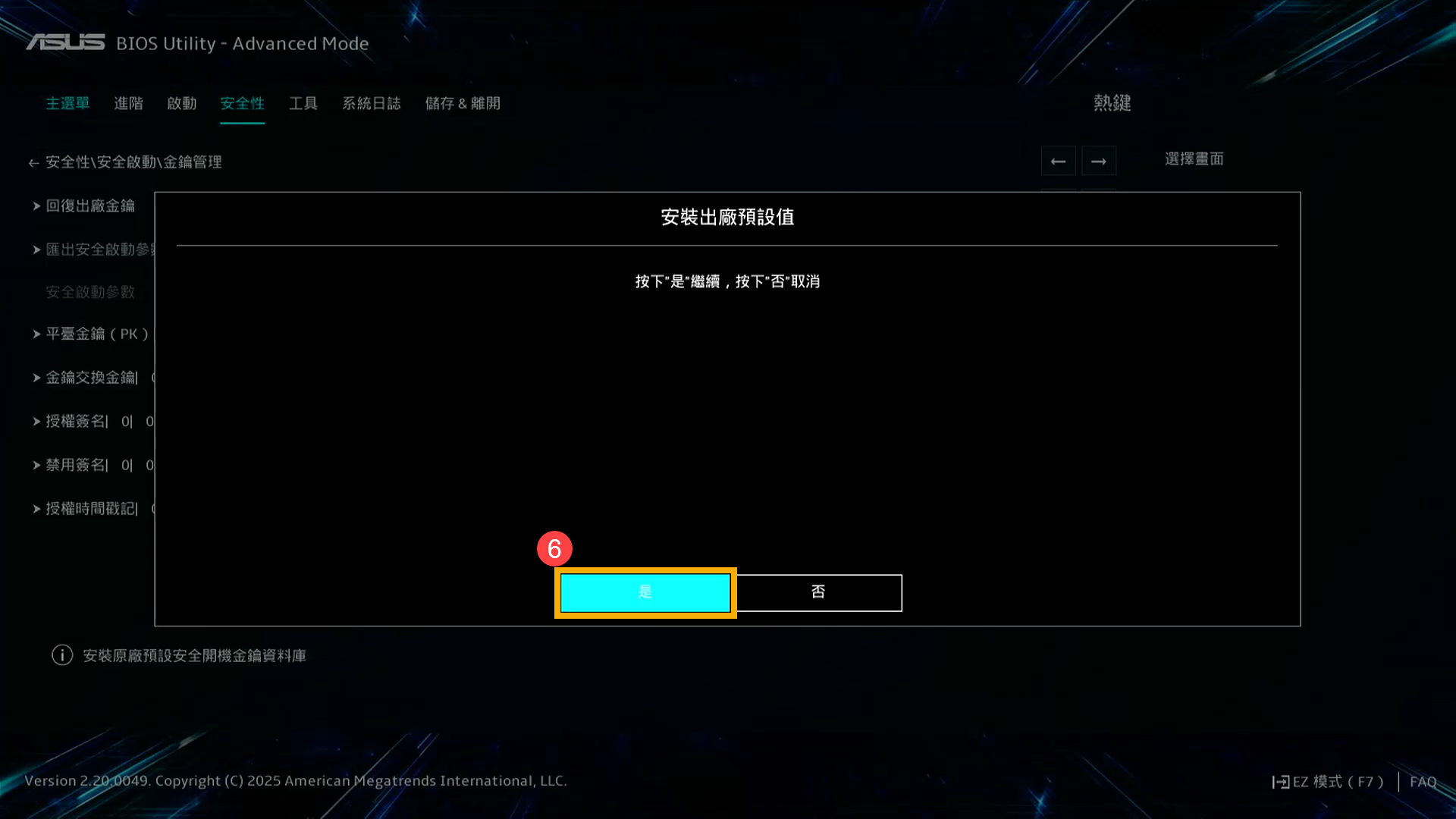 - 選擇[是]⑥以確認安裝出廠預設安全啟動金鑰資料庫。