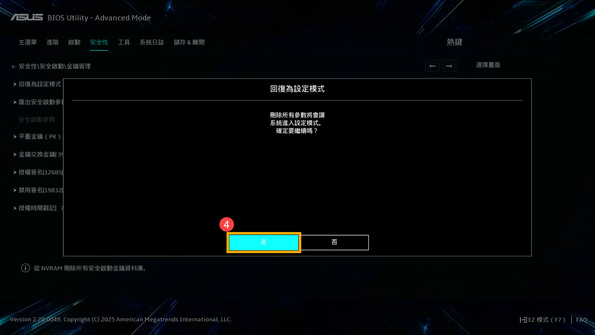 - 刪除所有安全啟動金鑰資料庫後,請選擇[回復出廠金鑰]⑤。
