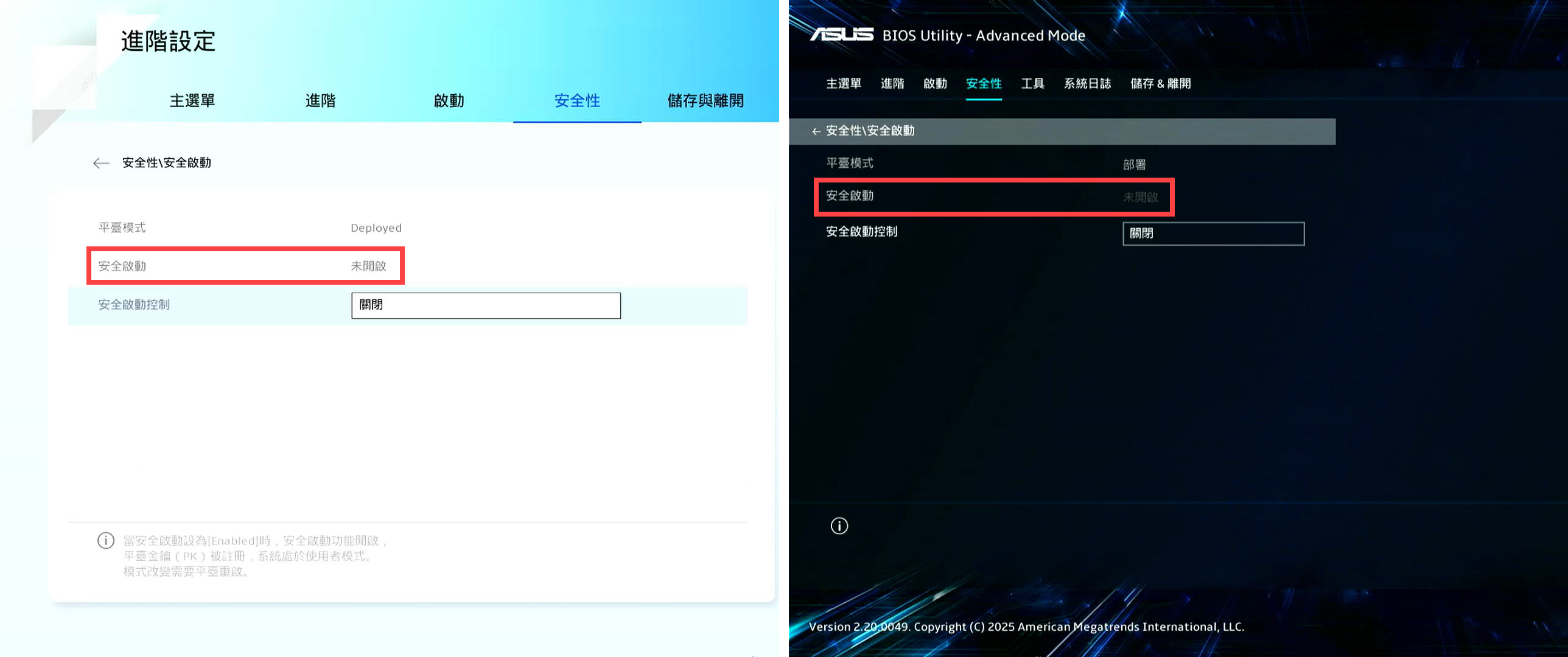 註:畫面中安全啟動狀態無法自行變更,但會隨著是否有「安全啟動金鑰」而改變。有安全啟動金鑰則為「使用者」狀態;沒有安全啟動金鑰則為「設定」狀態。