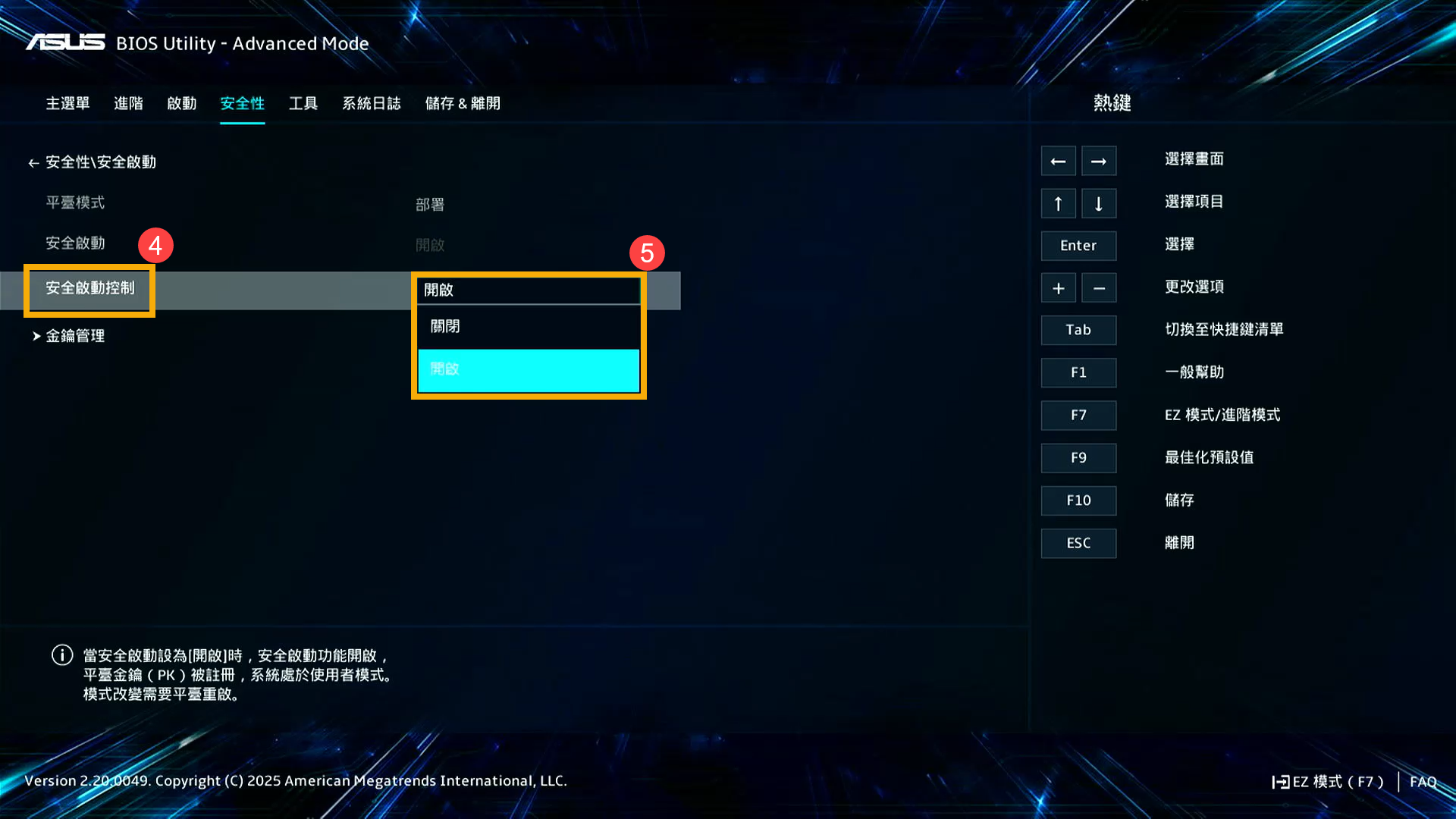 如何在UEFI介面中開啟安全啟動控制並回復金鑰