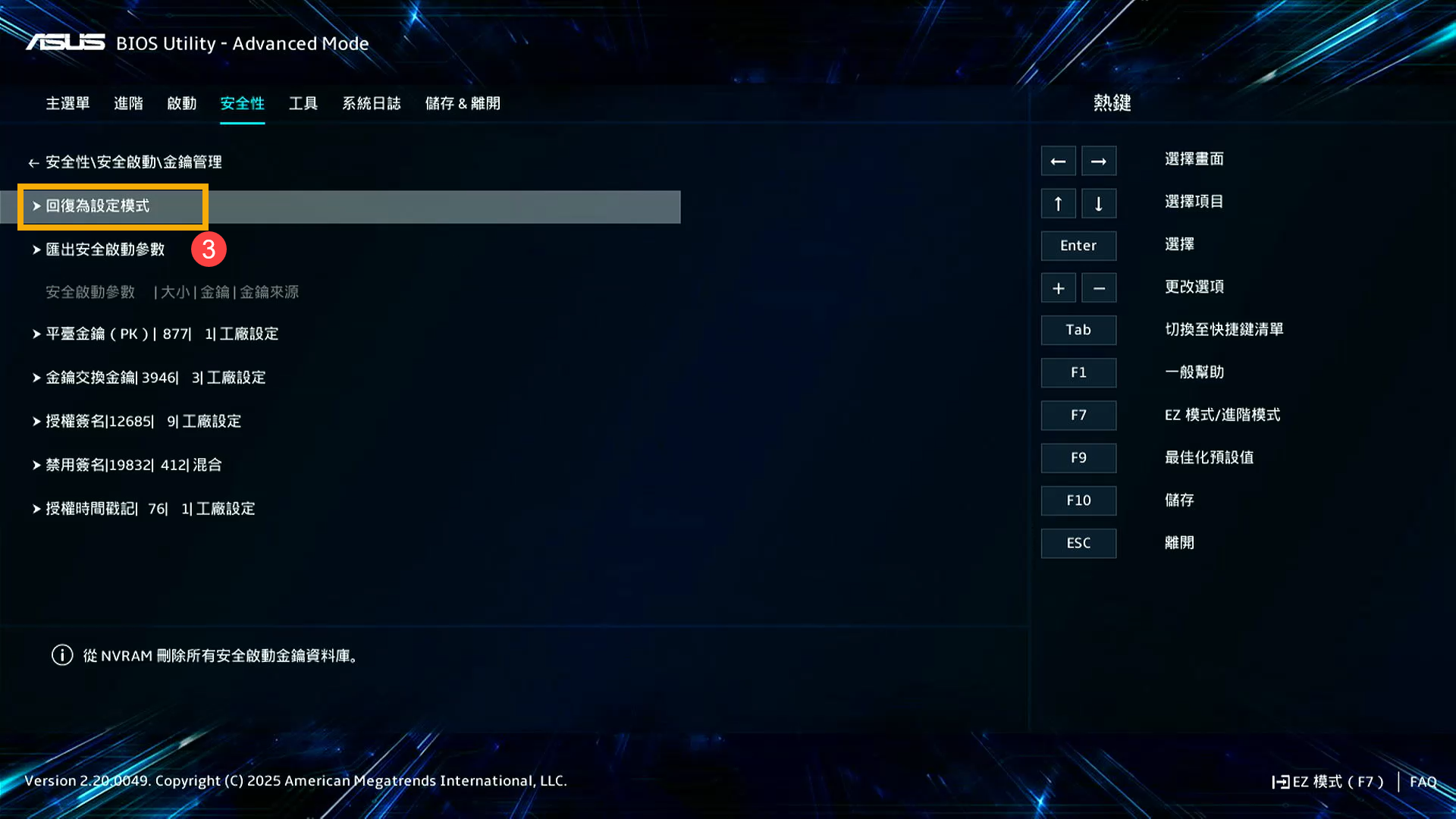 - 進入金鑰管理後,選擇[清除安全啟動驗證碼]③。