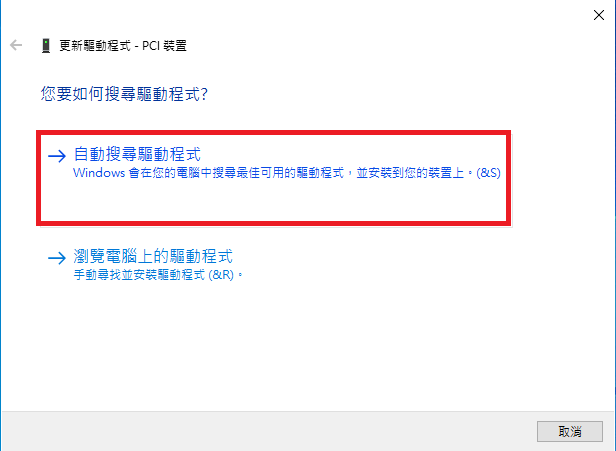 3. 點選[自動搜尋驅動程式]。Windows會先在您的電腦中搜尋最佳可用的驅動程式,並安裝至您的電腦上。