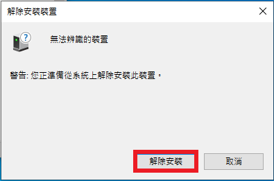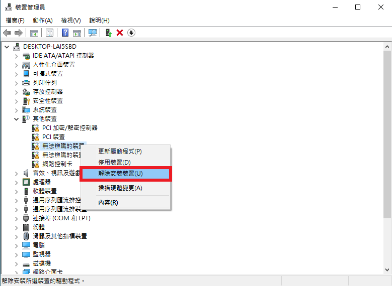2. 滑鼠右鍵點選黃色驚嘆號的裝置,然後點選[解除安裝裝置]。