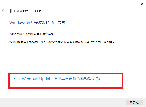 4. 如果在您的電腦中找不到適用的驅動程式,請點選[在Windows Update上搜尋已更新的驅動程式]。