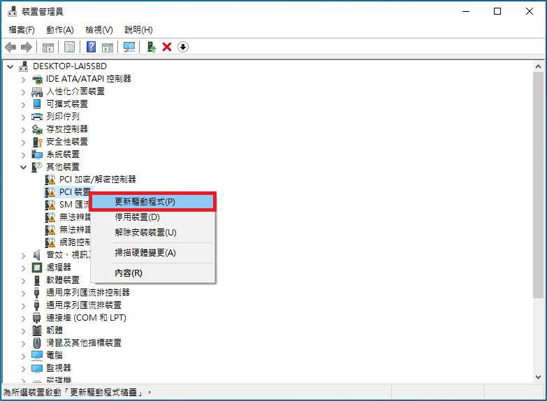 2. 右鍵點選帶有黃色驚嘆號的裝置,點選[更新驅動程式]。