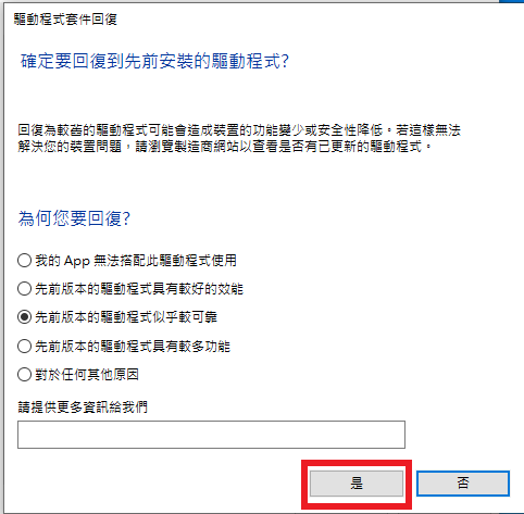 4. 選擇[您要回復到先前安裝的驅動程式的原因],然後點選[是]。系統將會開始回復驅動程式至先前的版本。