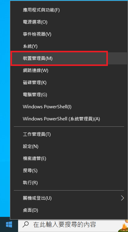 1. 滑鼠右鍵點選工作列上的[開始]圖示,然後點選[裝置管理員]。