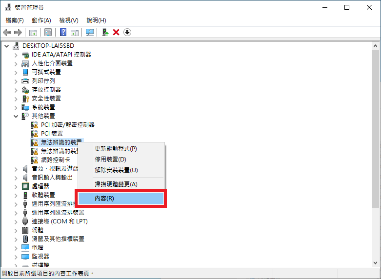 2. 滑鼠右鍵點選黃色驚嘆號的裝置,然後點選[内容]。