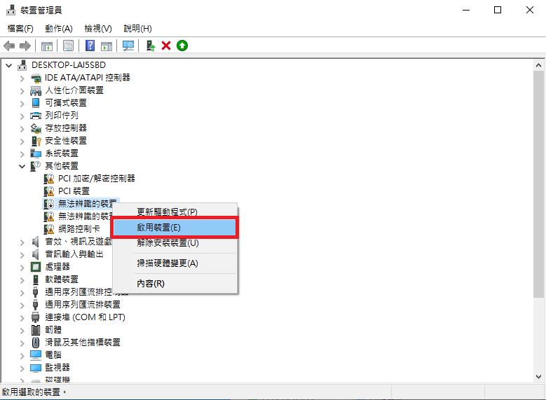 3. 此時,該裝置會顯示灰色或帶有停用標誌。滑鼠右鍵點選該裝置,點選[啓用裝置]選項,系統將會重新啓用該裝置。