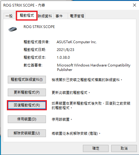 3. 點選[驅動程式],然後點選[回復驅動程式]。