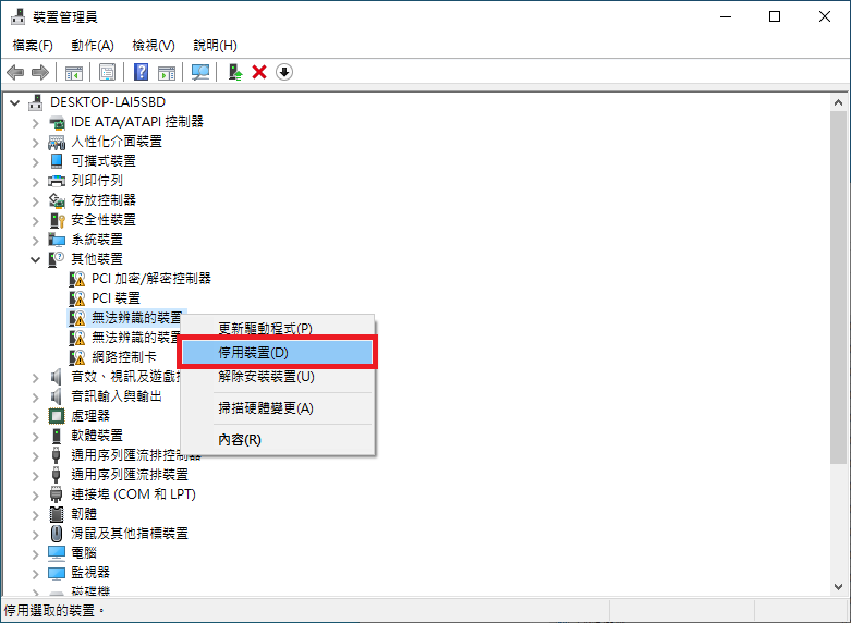 2. 滑鼠右鍵點選黃色驚嘆號的裝置,然後點選[停用裝置]。