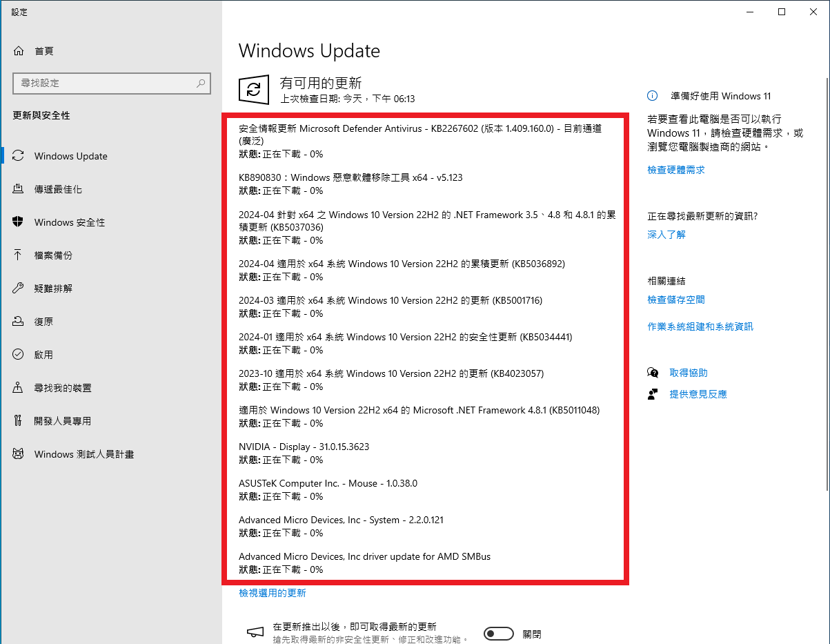 6. 搜尋到有可用的更新並完成下載及安裝後,請將您的電腦重新啓動。