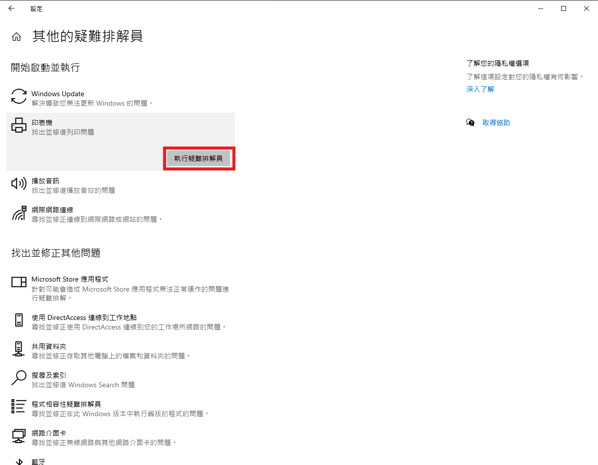 3. 選擇與裝置管理員出現黃色驚歎號裝置相關的疑難排解選項,點選[執行疑難排解員],如下舉例: 印表機